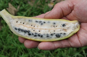 Banana naturala are foarte multe seminte si nu este la fel de placuta la gust. Cea pe care cu totii o stim, nu contine deloc seminte. Un fruct fara seminte este bun de consumat, insa nu este natural deoarece orice fruct are nevoie de seminte pentru a exista in natura, pentru a se reproduce.