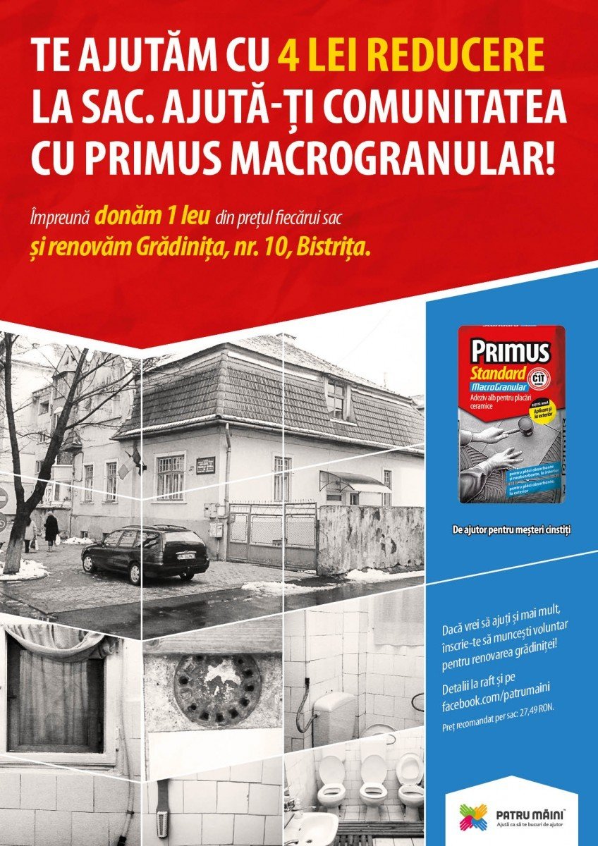 Campania „De ajutor pentru tine şi ai tăi!” îşi propune să încurajeze comunităţile locale să se implice direct în renovarea unor instituţii de învăţământ, centre de plasament, cantine şi spitale cu probleme, din toate zonele ţării. Astfel, în perioada 17 aprilie – 17 iunie 2013, în cadrul magazinelor Dedeman, cumpărătorii produsului PRIMUS Macrogranular vor beneficia de o reducere de 4 lei, din care 1 leu va merge într-un fond de donaţii destinat renovării celor 27 de clădiri selectate. Campania include o importantă componentă de voluntariat, întrucât orice consumator se poate înscrie pentru a participa activ la renovarea oricărei clădiri alese.