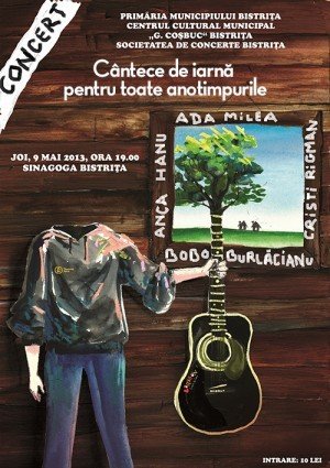 Primăria Municipiului Bistriţa, Centrul Cultural Municipal “George Coşbuc” Bistriţa si Societatea de Concerte Bistriţa prezintă joi, 9 mai 2013, ora 19:00 la Sinagoga Bistriţa concertul Cântece de iarnă pentru toate anotimpurile susţinut de Ada Milea, Bobo Burlăcianu, Cristi Rigman şi Anca Hanu. Intrare: 10 RON.