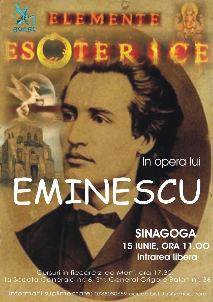Asociatia Gnostica de Studii Antropologice si Culturale (AGEAC) va invita la conferinta publica Elemente esoterice in opera lui Eminescu, care va avea loc pe 15 iunie, la ora 11.00, la Sinagoga din Bistrita.