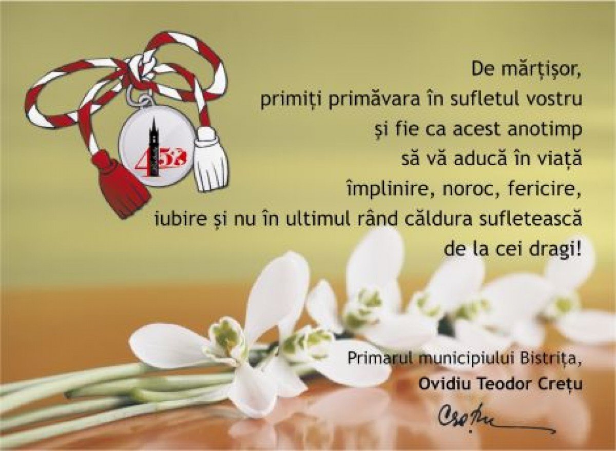 De mărţişor primiţi primăvara în sufletul vostru şi fie ca acest anotimp să vă aducă în viaţă împlinire, noroc, fericire, iubire şi nu în ultimul rând căldură sufletească de la cei dragi!