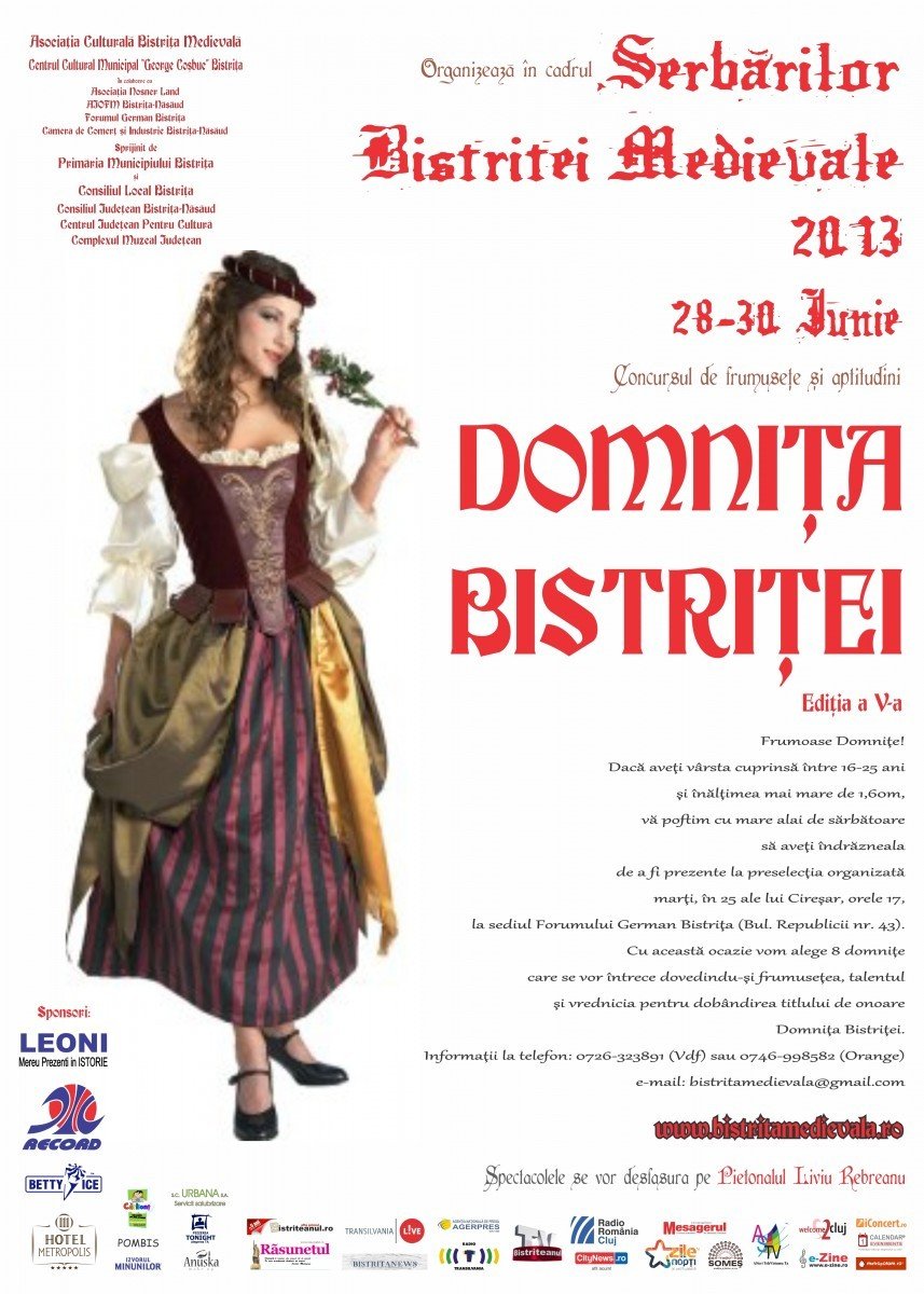 În căutarea frumuseţii şi a gloriei de odinioară a cetăţii, organizatorii Serbărilor Bistriţei Medievale 2013 le propun din nou bistriţenilor să o aleagă pe cea mai frumoasă şi vrednică domniţă din cetate. Astfel, sase-opt concurente care visează să devină DOMNIŢA BISTRIŢEI, se vor întrece pe parcursul serilor de sâmbătă şi duminică, 29 iunie respectiv 30 iunie, în probe de îndemânare şi cunoştinţe, potrivite cu specificul medieval.