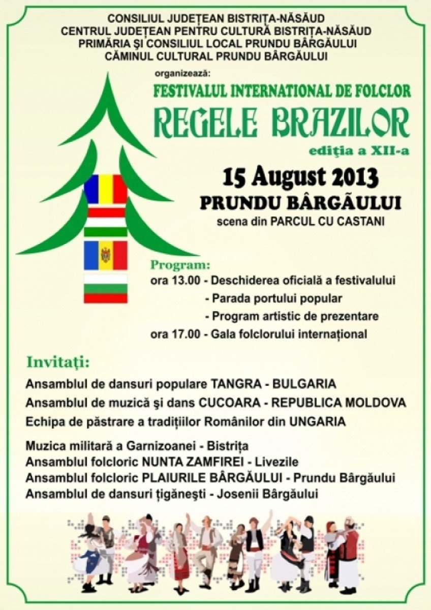 CONSILIUL JUDEŢEAN BISTRIŢA-NĂSĂUD, CENTRUL JUDEŢEAN PENTRU CULTURĂ BISTRIŢA-NĂSĂUD, PRIMĂRIA ŞI CONSILIUL LOCAL PRUNDU BÂRGĂULUI, CĂMINUL CULTURAL PRUNDU BÂRGĂULUI ORGANIZEAZA FESTIVALUL INTERNATIONAL DE FOLCLOR „REGELE BRAZILOR”. EDITIA a XII-a, 15 August 2013, LA PRUNDU BÂRGÃULUI PE SCENA DIN PARCUL CU CASTANI.