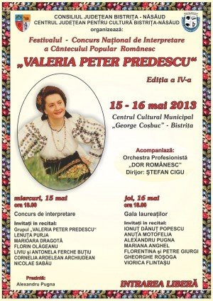 Consiliul Judeţean Bistriţa-Năsăud şi Centrul Judeţean pentru Cultură Bistriţa-Năsăud organizează în perioada 15 – 16 mai 2013, la Centrul Cultural Municipal „George Coşbuc”, cea de a IV-a ediţie a festivalului-concurs de interpretare a cântecului popular românesc „Valeria Peter Predescu”.