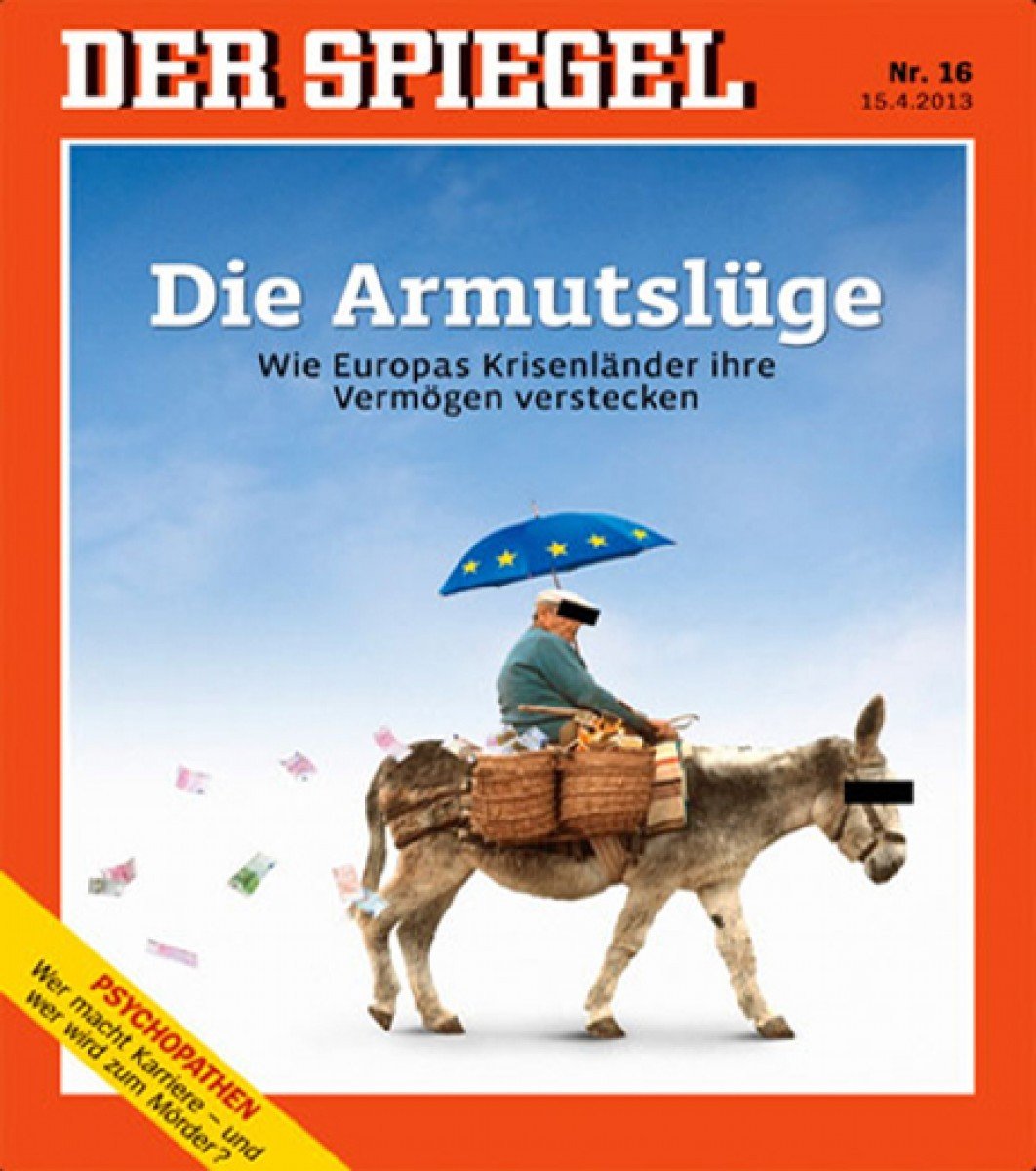 Saptamâna trecuta, pe coperta reputatei publicatii germane Der Spiegel trona un magar care ducea un grec si trei saci de bani. Grecul purta o umbrela în culorile Uniunii Europene. Titlul de deschidere “Minciuna saraciei – cum tarile europene în criza îsi camufleaza bogatia”.