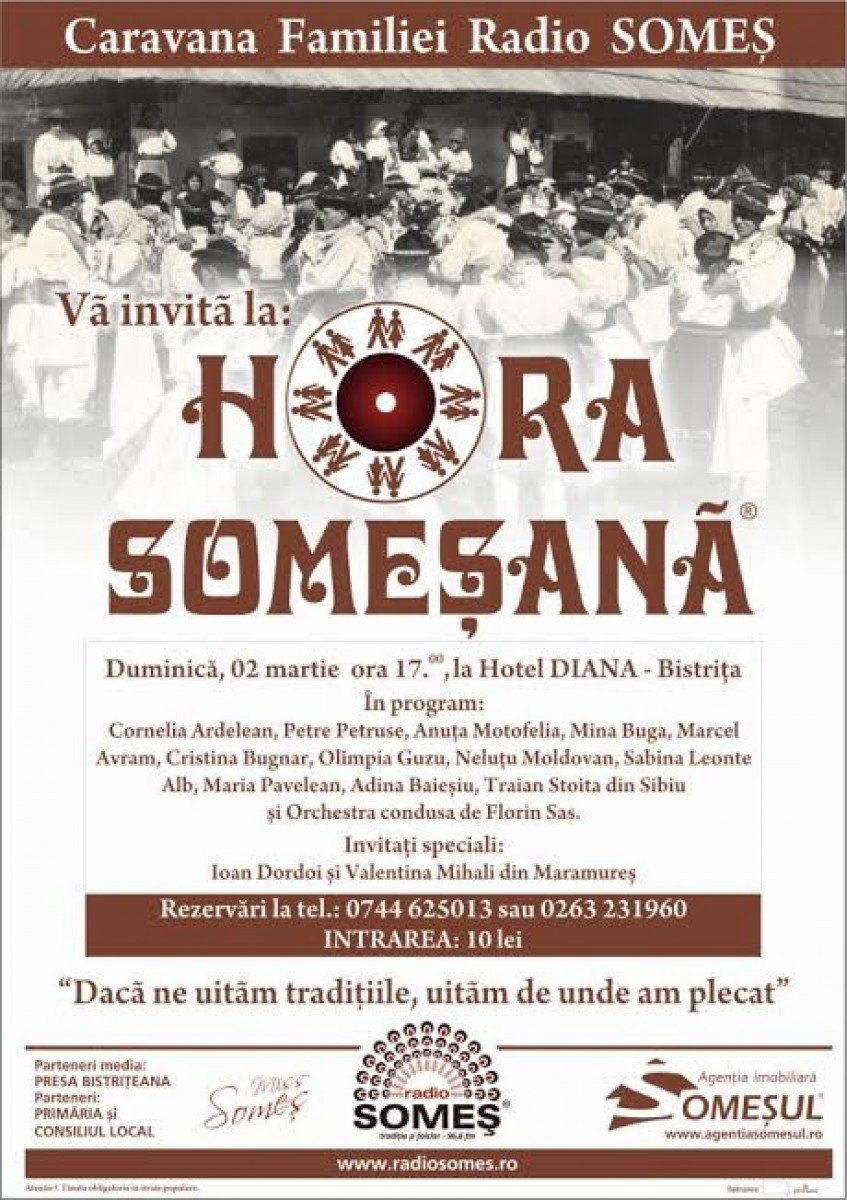 Gospodarii din Bistriţa-Năsăud petrec de „Lăsatul secului”, la Hora Someşană. Evenimentul se va desfăşura duminică, 2 martie 2014, începând cu ora 17,00 la Hotel Diana din Bistriţa.