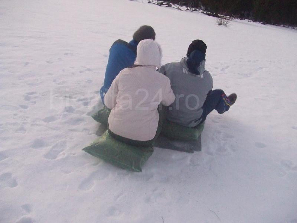 Nici zăpada cam puţină, nici lipsa săniilor nu a împiedicat un grup de turişti să alunce pe dealurile din Tihuţa ca pe pârtiile de la Sinaia. Aceştia au arătat că nu se tem să fie creativi şi ingenioşi, mai ales dacă distracţia o cere.