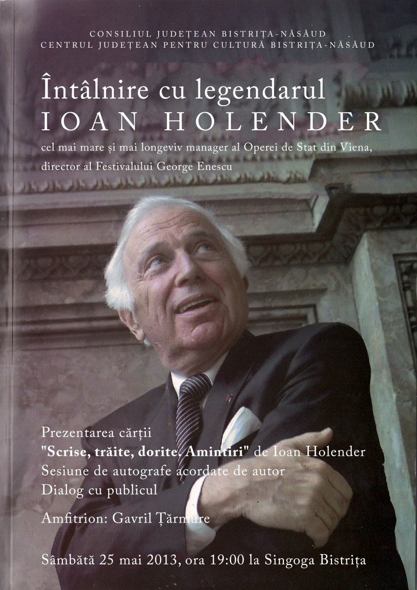 Consiliul Judeţean Bistriţa-Năsăud şi Centrul Judeţean Pentru Cultură Bistriţa-Năsăud vă invită la o „Întâlnire cu Legendarul Ioan Holender”. Sâmbătă, 25 mai 2013, de la ora 19:00 la Sinagoga Bistriţa