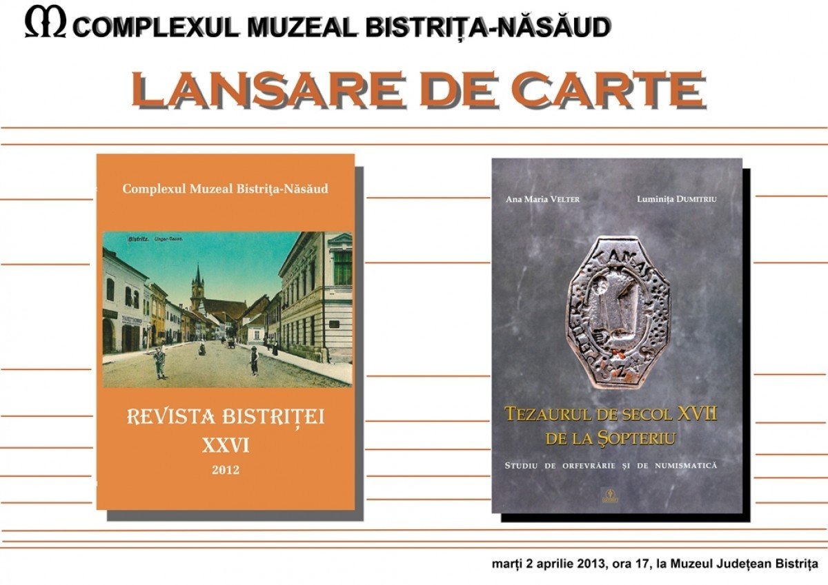 Marţi 2 aprilie, ora 17.00, Muzeul Judeţean are bucuria de a vă invita la lansarea ultimelor sale apariţii editoriale: Revista Bistriţei nr. 26 şi volumul Tezaurul de secol XVII de la Şopteriu.