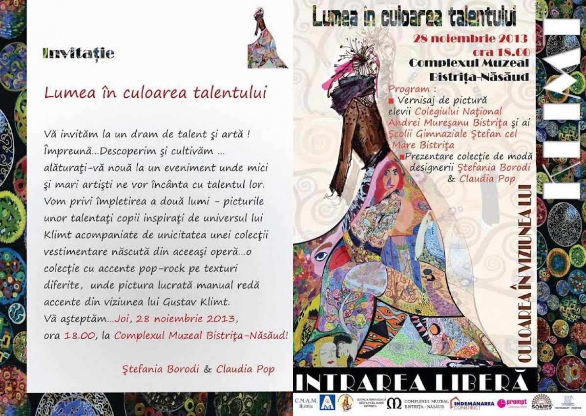 Joi, 28 noiembrie 2013, ora 18.00, la Complexul Muzeal Judeţean Bistriţa-Năsăud va avea loc lansarea colecţiei vestimentare „Culoarea în viziunea lui Klimt”, semnată de designerii Ştefania Borodi şi Claudia Pop.