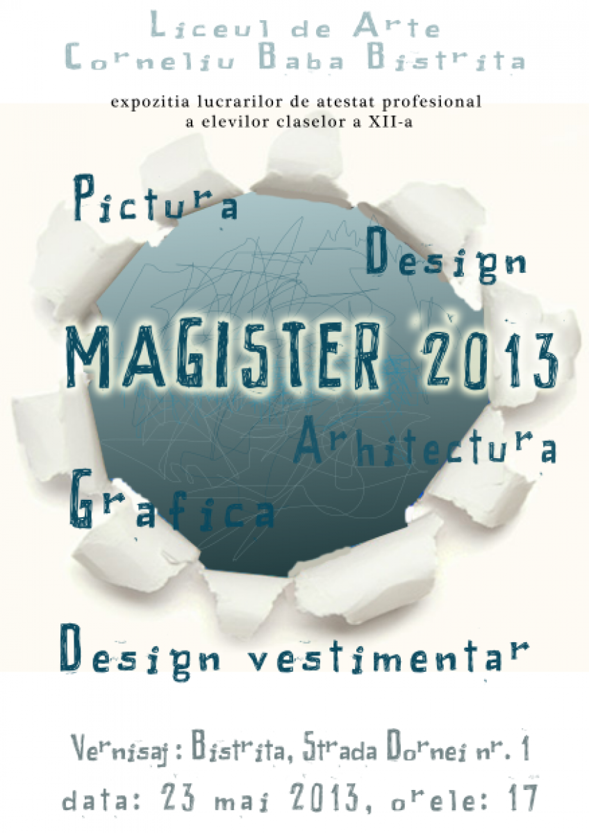 Liceul de Arte „Corneliu Baba” vă invită joi, 23 mai 2013, orele 17.00 , să participaţi pe strada Dornei Nr. 1 la vernisajul expoziţiei MAGISTER 2013.