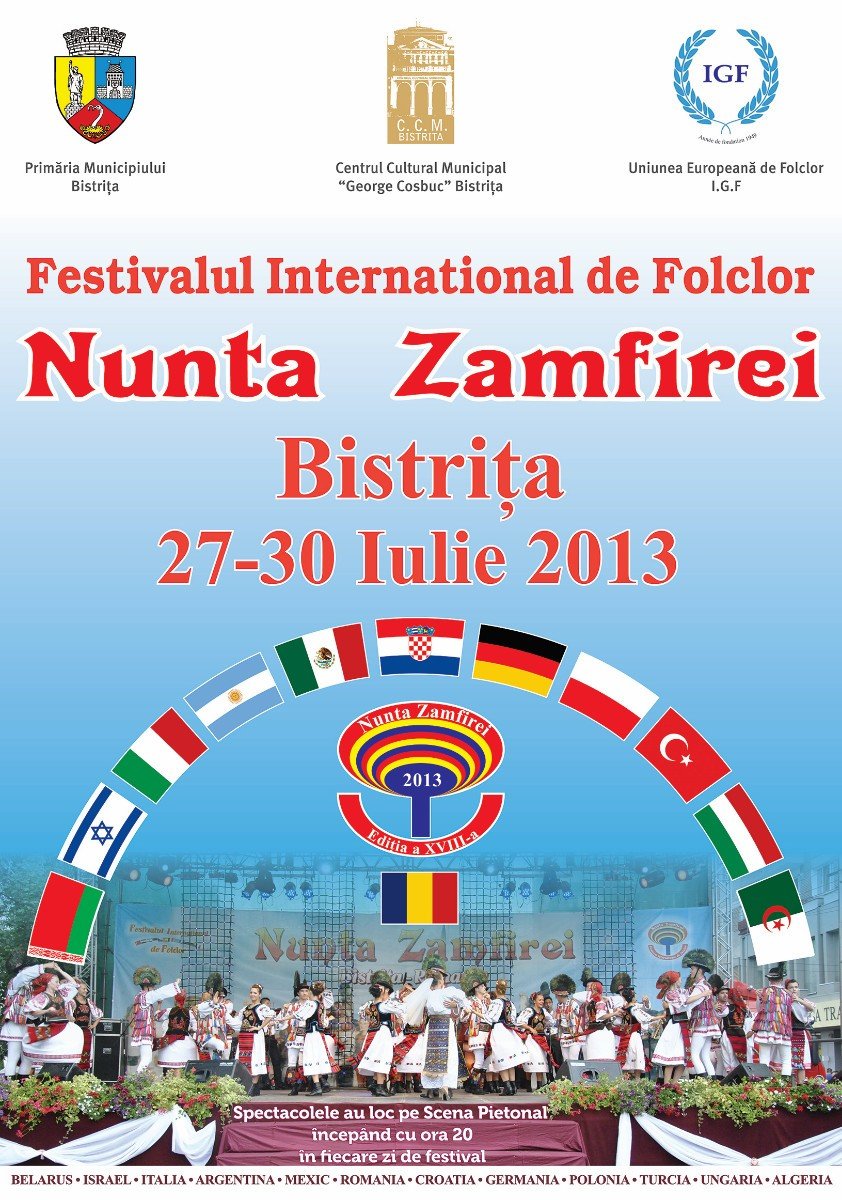 Primăria Municipiului Bistriţa, Centrul Cultural „George Coşbuc”, Bistriţa şi Uniunea Europeană de Folclor I.G.F., organizează în perioada 27-30 iulie 2013, Festivalul Internaţional de Folclor, Nunta Zamfirei.