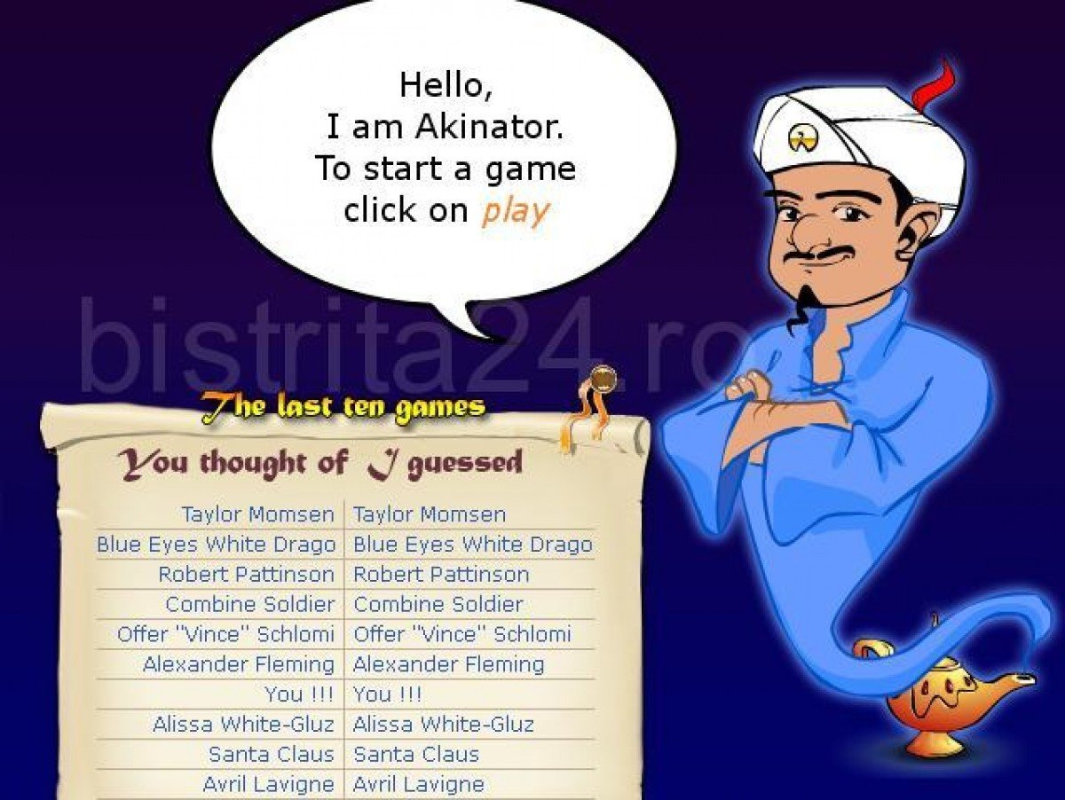 http://en.akinator.com/ nu are vraja la fel de puternică precum renumitul conquiztador, dar reuşeşte să te ţină ocupat o vreme cu ajutorul joculeţului pe care-l prezintă. Cu ajutorul unui număr de întrebări la care duhul din lampă te roagă să-i răspunzi încearcă să ghicească personajul la care te gândeşti. Mai exact după vreo 20 de întrebări şi câteva calcule, acesta vine cu un nume care se apropie cel mai tare de descrierea oferită de tine cu ajutorul răspunsurilor la întrebări.