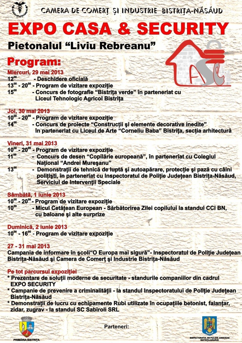Camera de Comerţ şi Industrie Bistriţa –Năsăud, în parteneriat cu Primăria Municipiului Bistriţa şi Inspectoratul de Poliţie Judeţean Bistriţa-Năsăud, organizează în perioada 29 mai – 2 iunie 2013, EXPO CASA & SECURITY 2013, în Zona Pietonală Liviu Rebreanu. Manifestarea expoziţională aduce cu sine noutăţi în ceea ce priveşte organizarea, incluzând pentru prima dată, un salon de soluţii pentru siguranţa locuinţelor şi construcţiilor industriale.