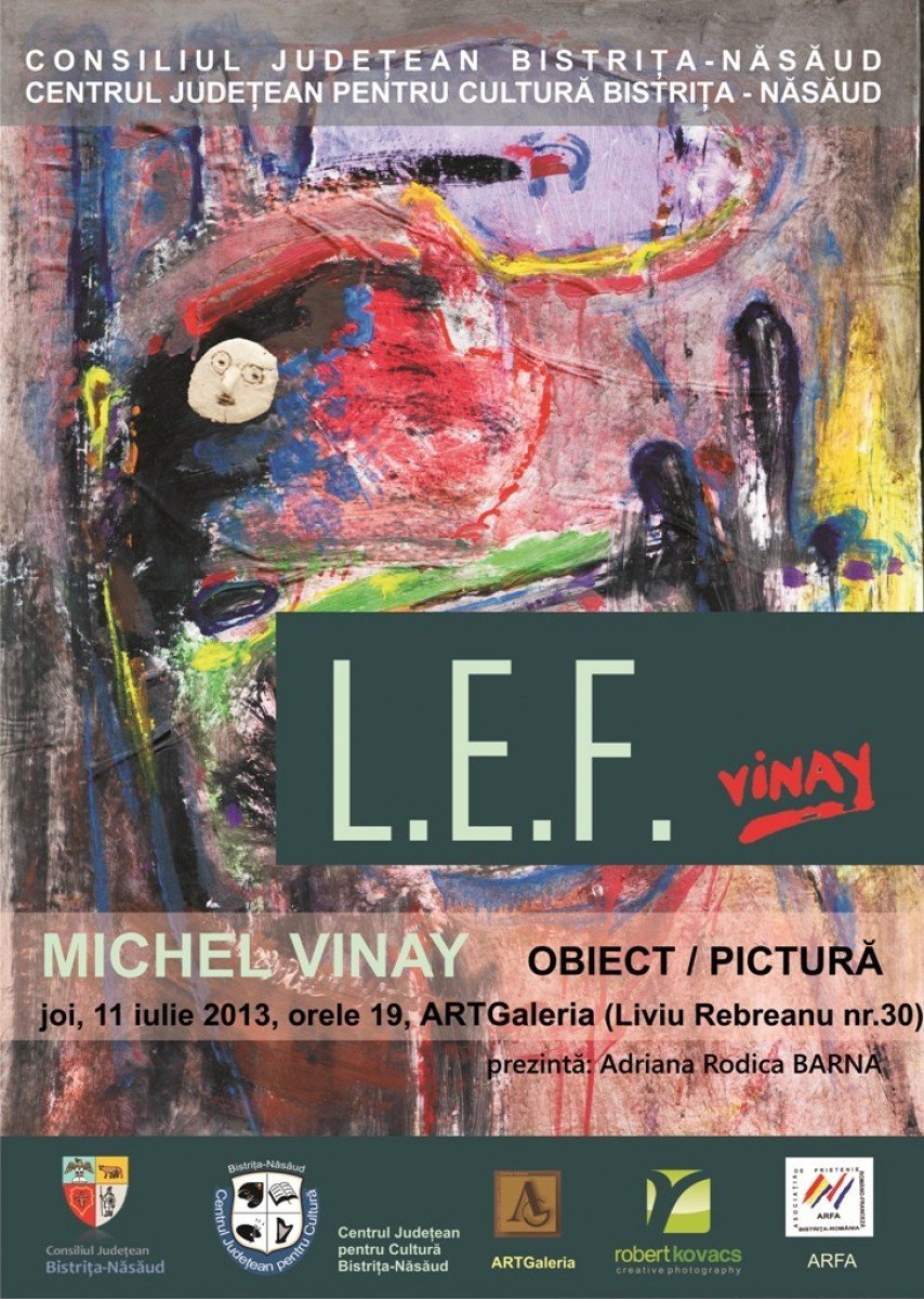 CONSILIUL JUDEŢEAN BISTRIŢA-NĂSĂUD, CENTRUL JUDEŢEAN PENTRU CULTURĂ BISTRIŢA-NĂSĂUD în colaborare cu ARFA (Asociaţia de Prietenie Româno-Franceză) vă invită JOI, 11 IULIE 2013, ORA 19, la expoziţia personală de pictură şi obiect a artistului plastic francez MICHEL VINAY. Evenimentul are loc la ArtGaleria si este prilejuit de Ziua Naţională a Franţei.