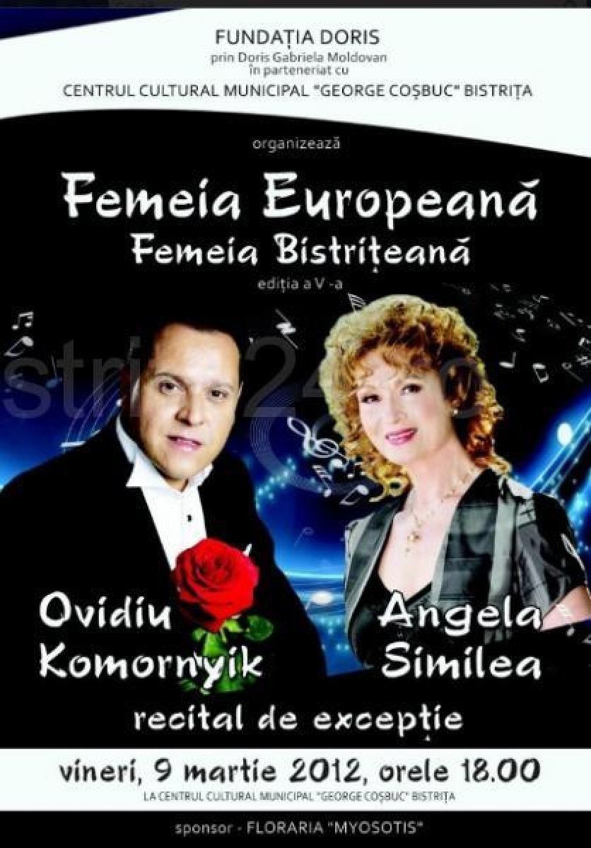 Evenimentul ”Femeia Europeană, Femeia Bistriţeană” pus la cale de fosta şefă a Agenţiei pentru Ocuparea Forţei de Muncă Bistriţa-Năsăud, Doris Moldovan, şi programat pentru seara aceasta vine să premieze 10 femei deosebite ale judeţului, dar oferă celor prezenţi şi un mărţişor muzical. Pe scenă vor urca şi Angela Similea şi Ovidiu Komornyik, conform ziarelor naţionale artista muncind din greu să acopere datoriile lăsate de soţul său.
