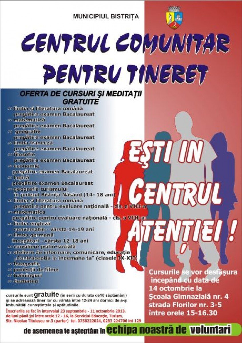 Copiii cu vârste cuprinse între 12- 18 ani au posibilitatea sa facă cursuri gratuite, predate de către profesori abilitaţi la Centrul Comunitar pentru Tineret, unde aceştia oferă serviciile sub formă de voluntariat. Cursurile se desfăşoară la Şcoala Gimnazială nr. 4 din strada Florilor nr. 3 – 5, în zilele de luni – joi, între orele 15.00 – 16.30  şi sunt organizate cu ajutorul de Primăriei Bistriţa.